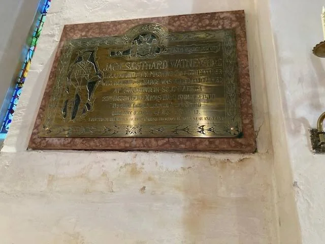 A modern brass on the south wall is interesting as being the first picture of a soldier’s khaki uniform on a memorial. It is to Jack Watney, a lad of 19 who fell in South Africa in 1901.