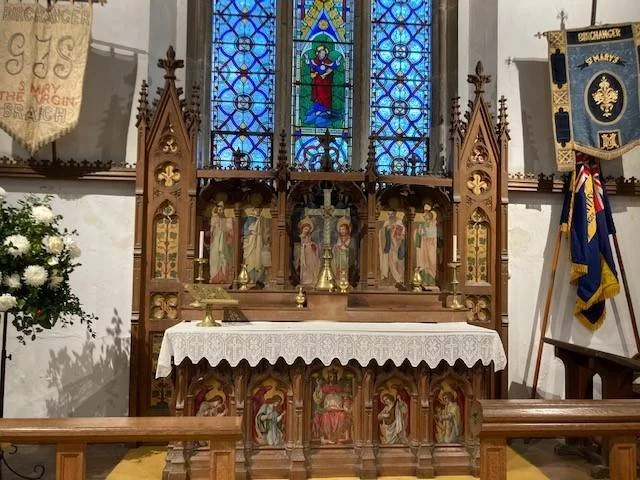 The reredos and holy table are in carved oak, the gift of Mr Harrison and Mr Gold.